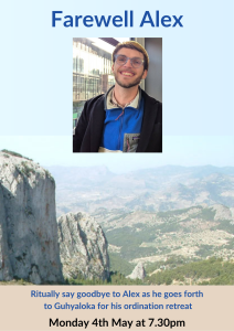 04/05/2026 @ 7:30 pm – 9:30 pm – Ritually say goodbye to Alex as he goes forth to Guhyaloka for his ordination retreat!