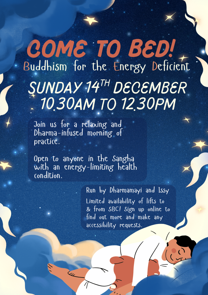 BED! Buddhism for the Energy Deficient is taking place on Sunday 14th December 10.30am to 12.30pm.