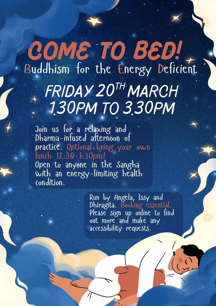 BED! Buddhism for the Energy Deficient is taking place on Friday 20th March 1.30pm to 3.30pm.